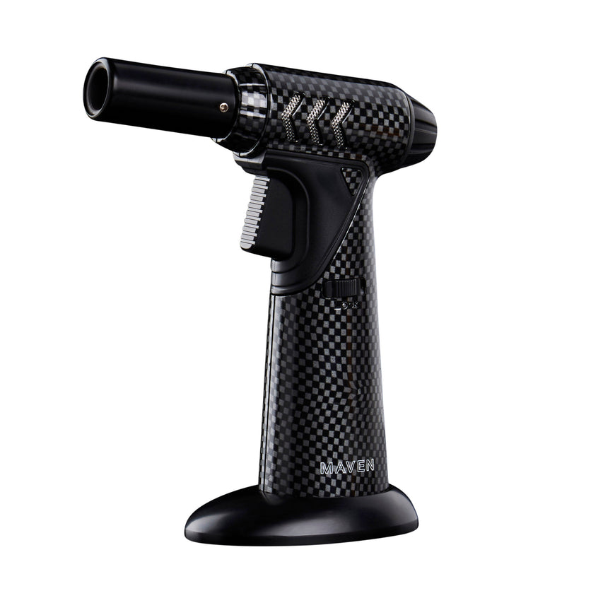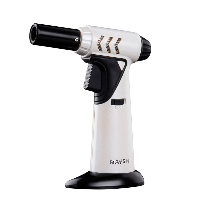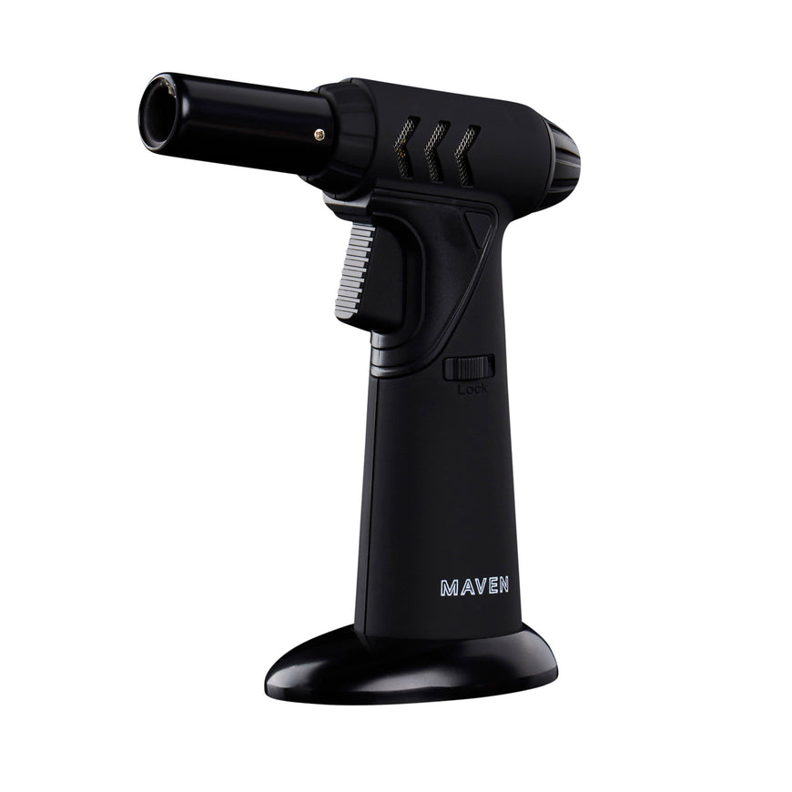 The Maven Tornado Dab Torch is a versatile table torch that is perfect for any dabbing setup. It features a single windproof jet flame and adjustable flame intensity, making it suitable for both indoor and outdoor dabbing. The torch also has a trouble-free ignition button, a safety lock function and is refillable with butane.