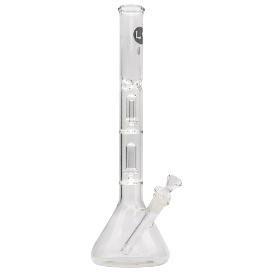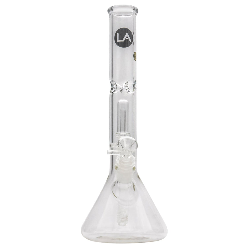 LA Pipes offers a top-selling, timeless design in their 12 or 14 inch tall beaker waterpipe with single or double showerhead perc. These showerhead percs provide excellent diffusion, making them superior to tree percs in terms of durability and ease of cleaning. The waterpipe is constructed with heavy wall 34mm tubing and features a beaker base, ground glass-on-glass fittings, 6-slit diffusion, and a glass bowl. Additionally, it includes an ice-pinch for adding ice to cool the smoke for a smoother experience on your mouth and throat.