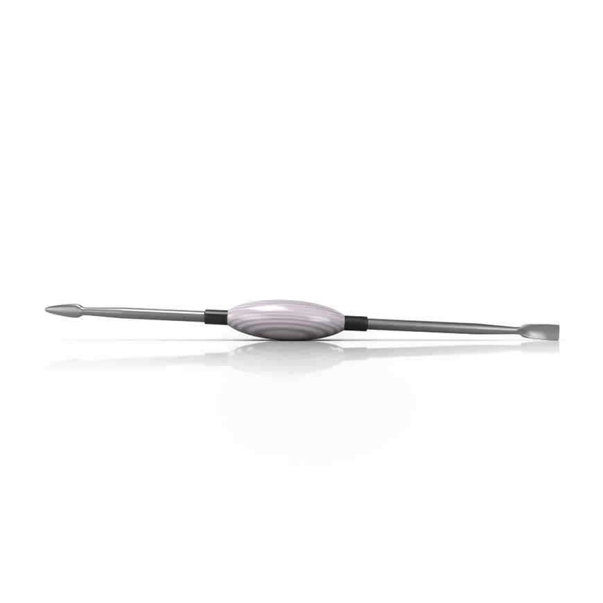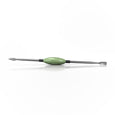 This Oval Dab Tool is a dual-sided, middle glass-handled, and stainless steel tipped. It comes in 5 different color options, features a flat-like spatula scoop on one edge, and has a pointed spade tip on the opposite end.